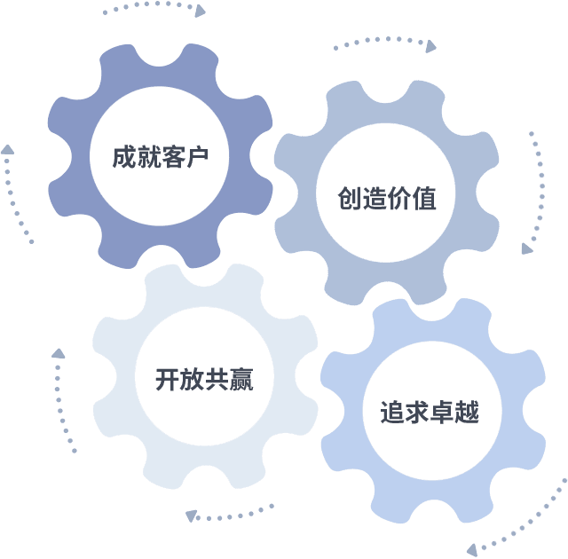 成就客户是一切决策的出发点,,创造价值是衡量所有工作的标准,,,追求卓越是我们做事做人的态度,,,开放共赢是我们的格局也是最终的结果。。价值观的齿轮环环相扣,,推动着组织里的每个人不断向前。。。