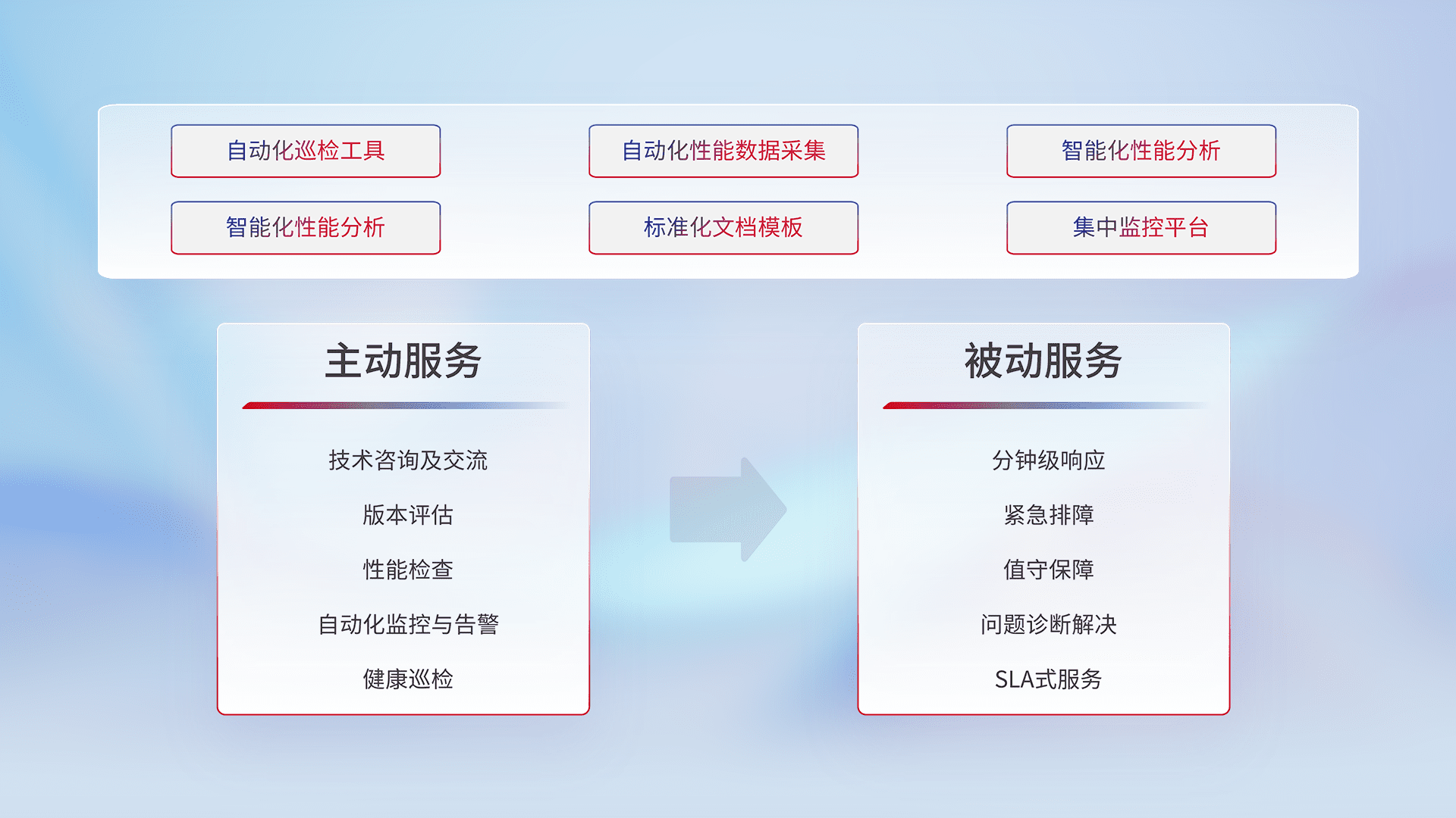 智能化工具和标准化文档,,,保障服务质量,,,,提供主动服务(包含技术咨询、、版本评估、、、性能检查、、、自动化监控与告警、、、、健康巡检)和被动服务包含(分钟级响应、、、、紧急排障、、、值守保障、、、、问题诊断解决、、、、SLA服务)。。